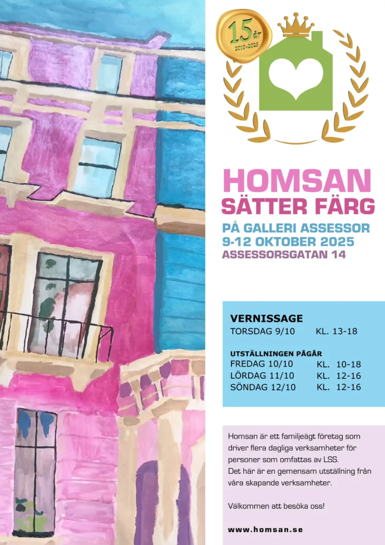 Homsans dagliga verksamhet bjuder in till konstutställningen ”Homsan sätter färg på Galleri Assessor” den 9-12 oktober. Utställningen är en gemensam konstutställning från flera av Homsans skapande verksamheter.